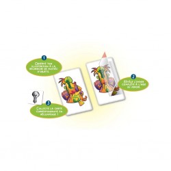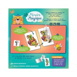 Retournez les moitiés et assemblez-les à l'aide des cartes miroir : une ligne courbe peut se transformer en aubergine, un gribouillis en palmier géant. Laissez parler votre imagination pour reconstituer les images et deviner ce qui se cache de l’autre côté du miroir.