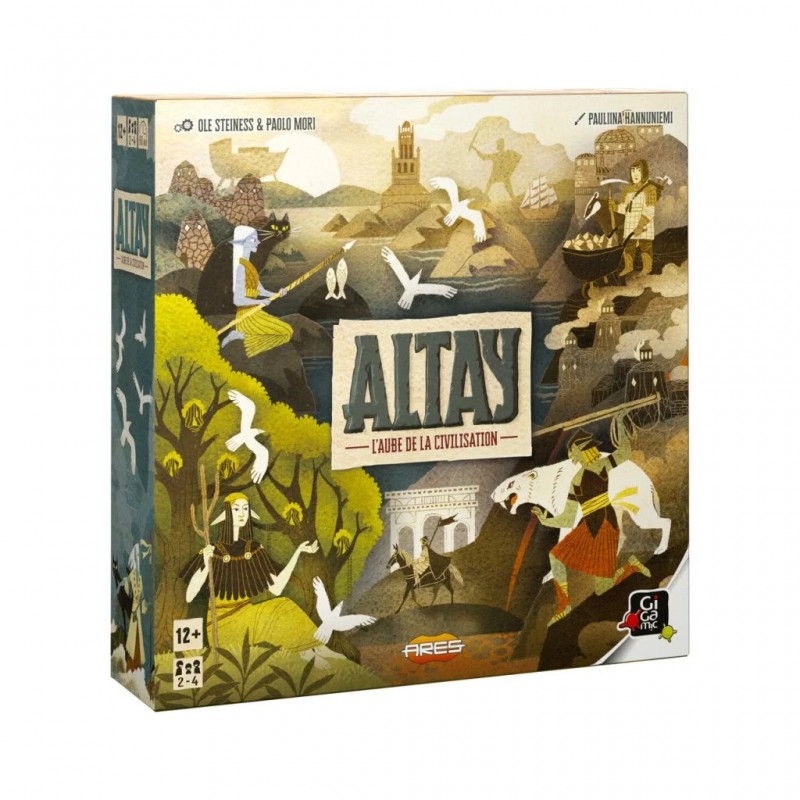 Altay — L'Aube de la Civilisation combine deck-building, développement de civilisation et contrôle de territoires. Chaque joueur incarne l’une des quatre factions, dotée d’un deck de départ aux cartes propres et d’une composition initiale légèrement différente. À chaque tour, vous jouez vos cartes pour produire des ressources (pierre, métal, bois, connaissances), fonder des colonies, vous étendre sur le plateau, attaquer ou défendre, et manipuler votre deck ou votre main.